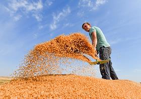 Сбор урожая пшеницы в Оренбургской области. Разгрузка зерна из кузова грузового автомобиля на…