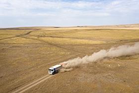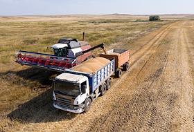Сбор урожая пшеницы в Оренбургской области. Вывоз зерна в грузовом автомобиле с поля.
