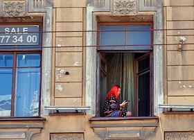 Виды Санкт-Петербурга. Жанровая фотография. Девушка с красными волосами в окне жилого дома.
