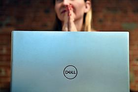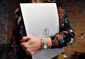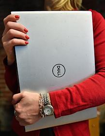 Жанровая фотография. Девушка держит в руках компьютер фирмы Dell.