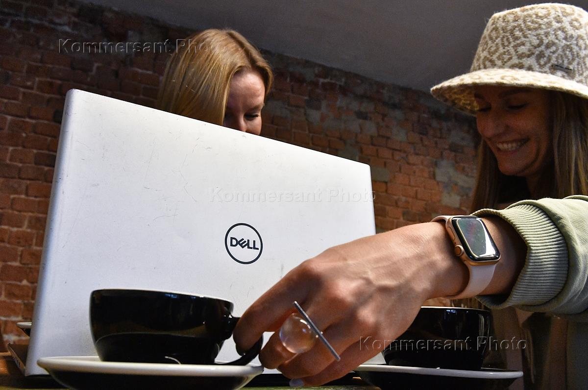 Жанровая фотография. Девушки за столиком кафе с ноутбуком "Dell".
