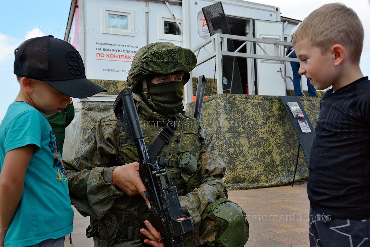 Работа мобильного пункта набора на военную службу по контракту в парке "Левобережный". Жанровая…