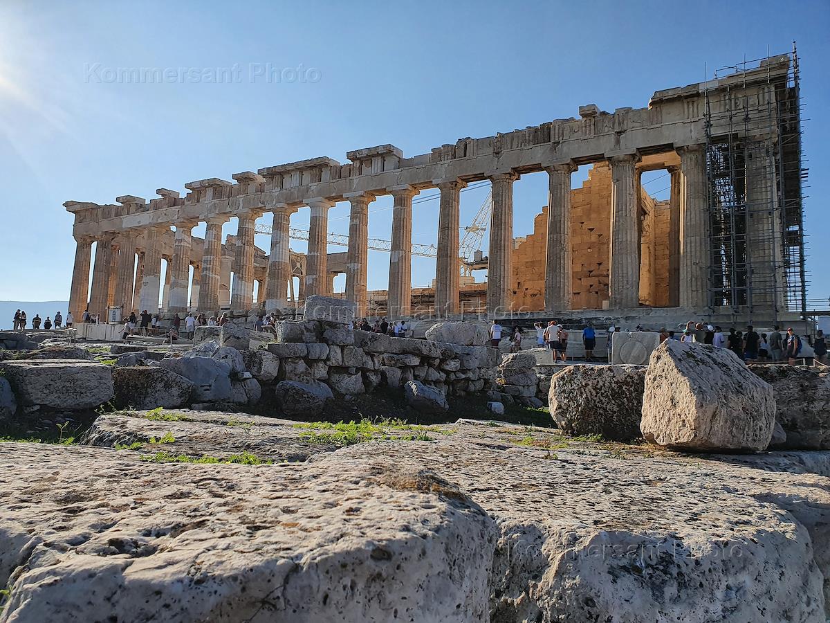 Виды Афин. Жанровая фотография. Туристические группы на Акрополе. Парфенон