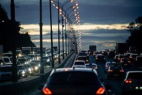 Жанровая фотография. Автомобили на дороге на фоне заката солнца.