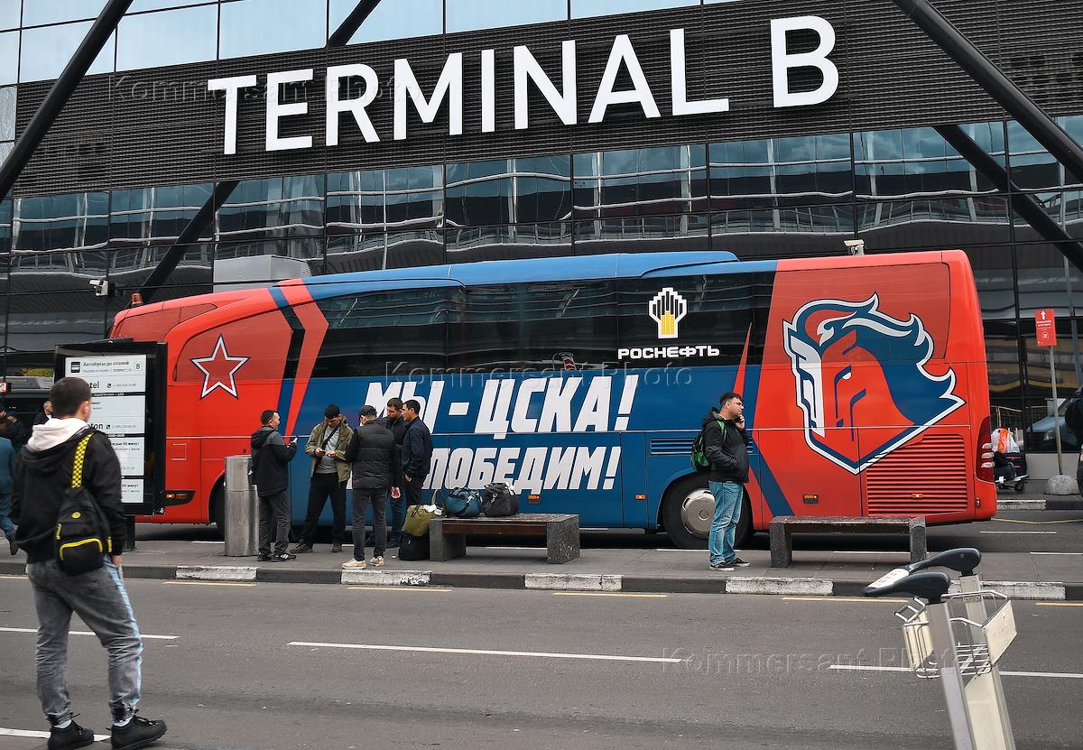 Жанровая фотография. Автобус команды ЦСКА у терминала В аэропорта Шереметьево имени А.С. Пушкина.