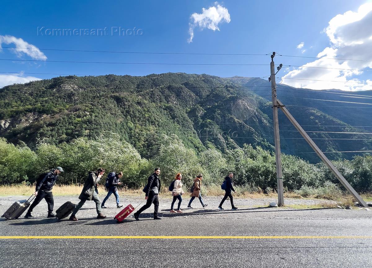 Ситуация у пограничного и таможенного пункта "Верхний Ларс"-"Казбеги". Люди с чемоданами на дороге.