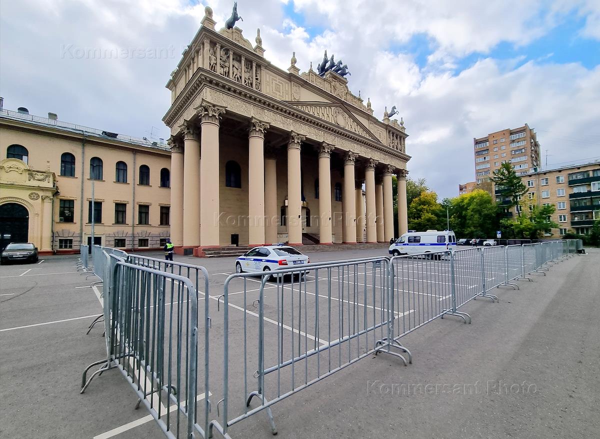 Виды Москвы. Жанровая фотография. Ограждение и автомобили полиции перед входом на Центральный…