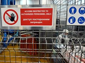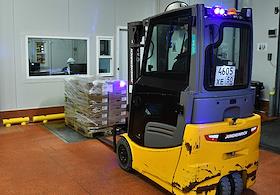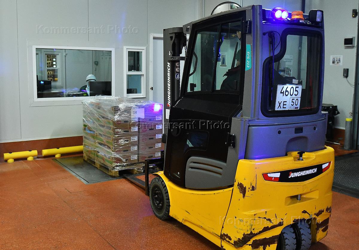 Работа завода-робота по производству сырокопченых колбас "Черкизово-Кашира". Погрузчик на складе.