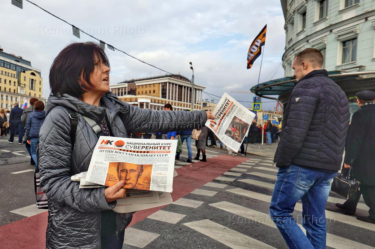 Жанровая фотография. Женщина-волонтер раздает на улице газету "Национальный курс".