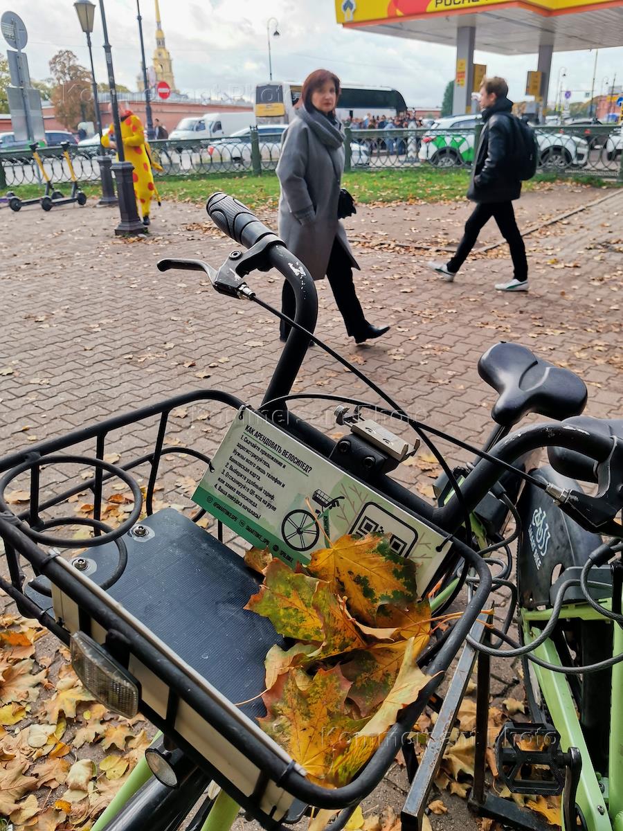 Виды Санкт-Петербурга. Жанровая фотография. Желтые листья клена в багажной корзине велосипеда.