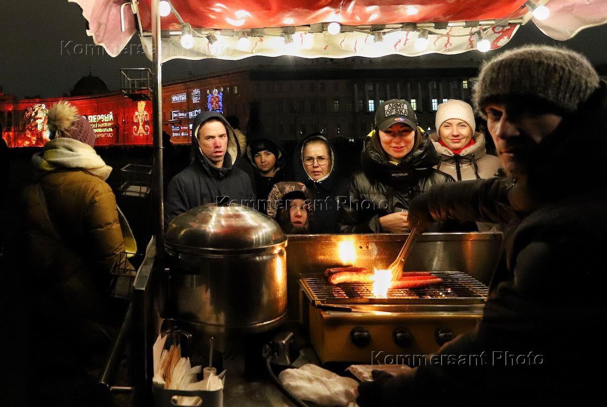 Виды Санкт-Петербурга. Жанровая фотография. Посетители уличной палатки по продаже сосисок.