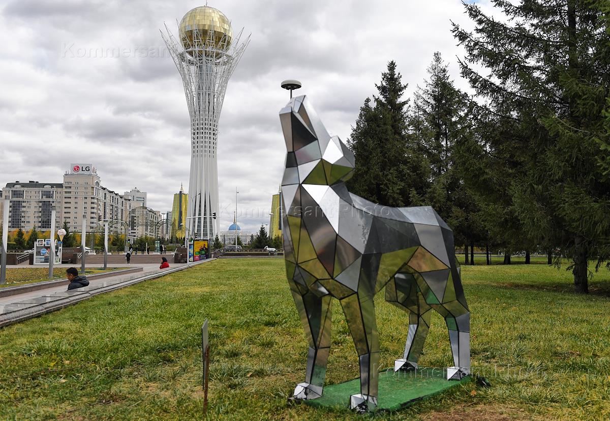 Виды Астаны. Парковая скульптура на бульваре "Нуржол" на фоне монумента "Байтерек".