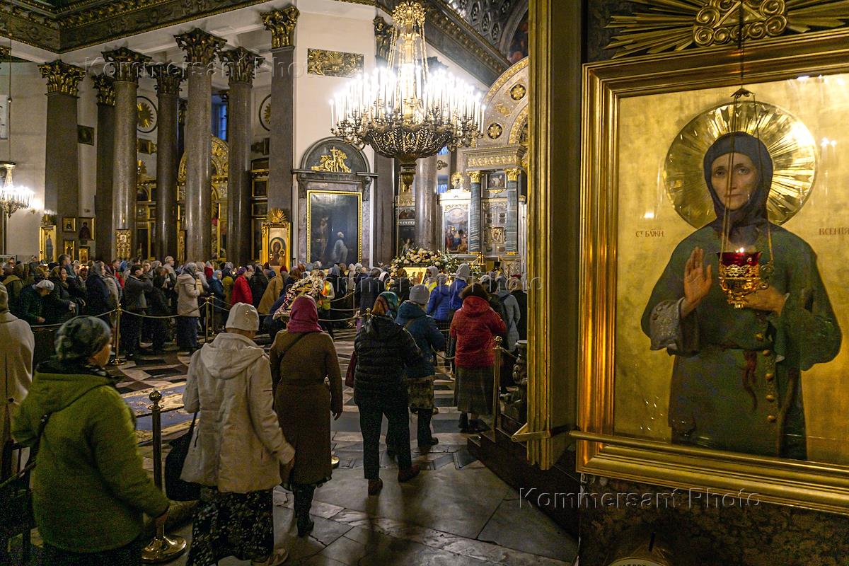 Жанровая фотография. Верующие в Казанском кафедральном соборе в очереди к ковчегу с мощами…
