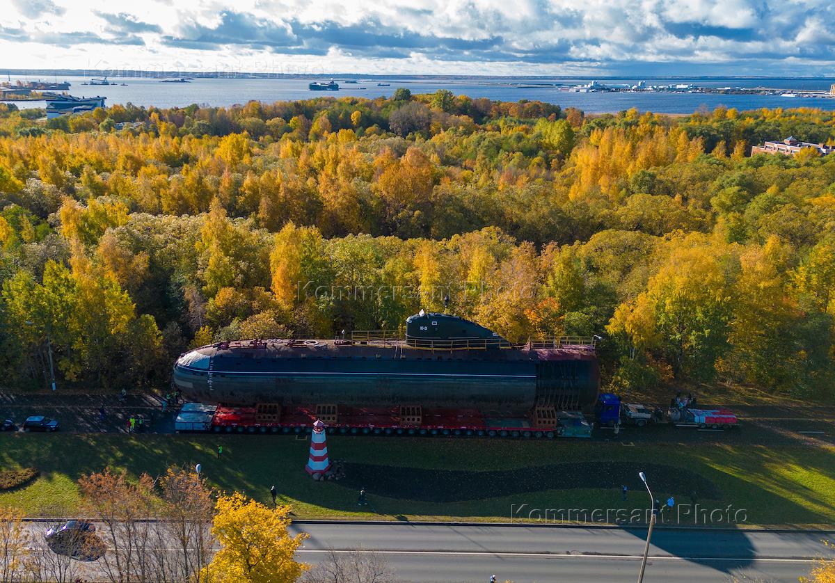 Сухопутное перемещение носовой части подводной лодки К-3 по улицам Кронштадта к зданию Музея военно-морской славы.