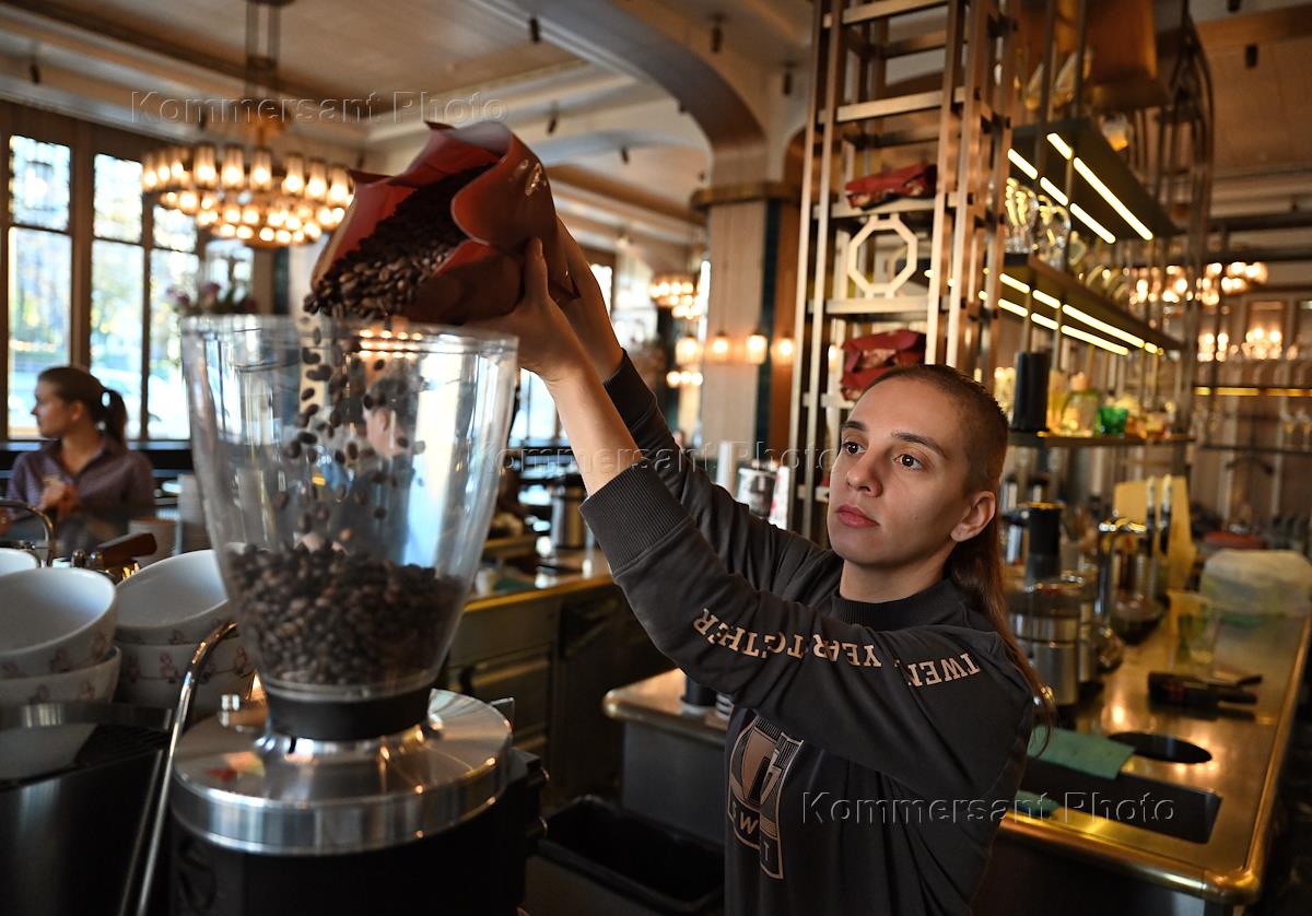 Работа кофейни "Кофемания" у станции метро "Лубянка". Жанровая фотография. Бариста засыпает зерна…