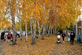 Виды Омска осенью. Жанровая фотография. Люди гуляют по улице города. Торговля овощами у местных…