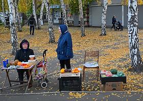 Виды Омска. Уличная торговля. Пожилые женщины торгуют овощами и фруктами, выращенными на своих…
