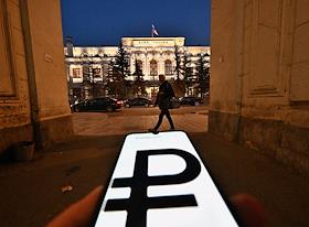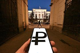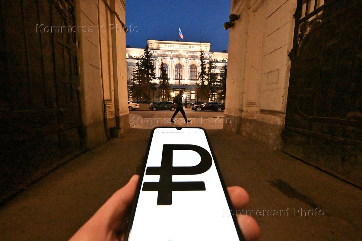 Жанровая фотография. Здание Центрального Банка России на Неглинной улице. Логотип рубля на экране…