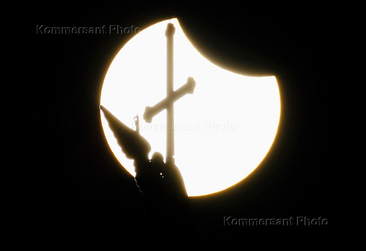 Жанровая фотография. Вид на флюгер Петропавловского собора во время солнечного затмения.
