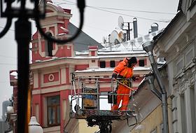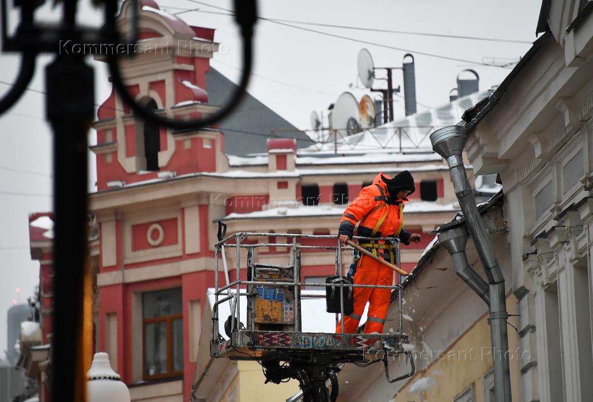 Виды Москвы. Жанровая фотография. Рабочий чистит крышу от снега и сосулек.