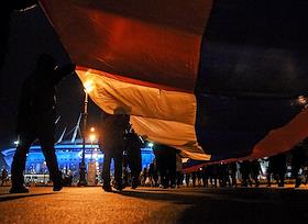 Общество Граждане Сербии и России перед товарищеским матчем футбольных команд "Зенит" (Санкт-Петербург, Россия) и «Црвена Звезда» (Белград, Сербия) развернули российско-сербский 600-метровый флаг, который ранее был пронесен по улицам Белграда в знак поддержки России.