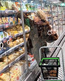 Супермаркет сети "Пятерочка". Покупательница в отделе "Сыры".