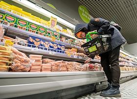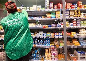 Супермаркет сети "Пятерочка". Продавец раскладывает товар в отделе "Сыр".