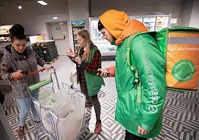 Супермаркет сети "Пятерочка". Сборщики доставки продуктов "Сбер Маркет" в отделе супермаркета.