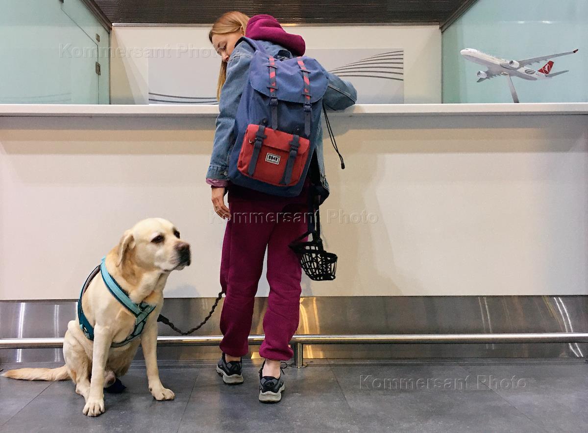 Жанровая фотография. Девушка с лабрадором ретривером у стойки в аэропорту Пулково.