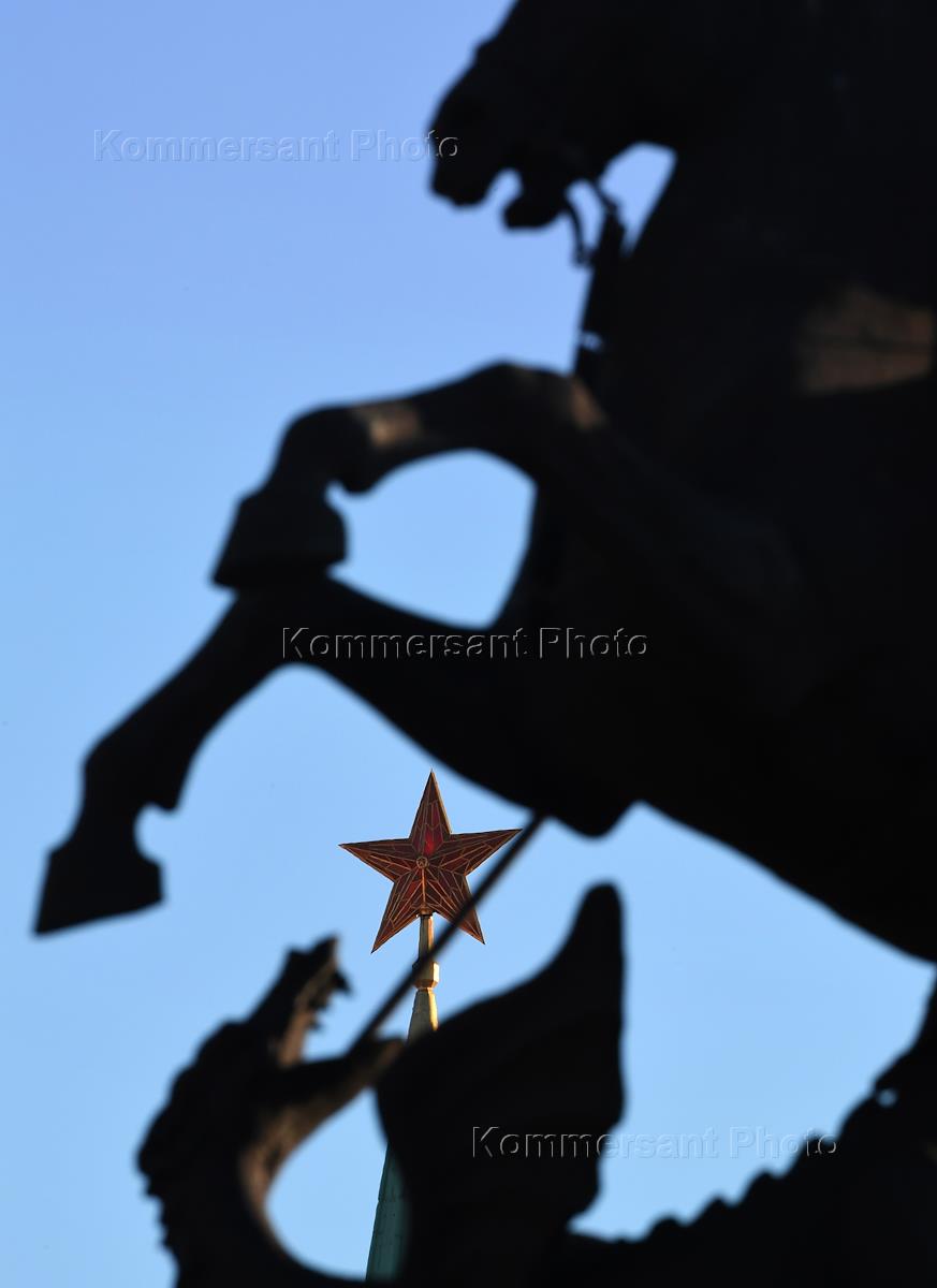 Жанровая фотография. Рубинова звезда на башне Кремля и скульптура Георгий Победоносец на куполе…