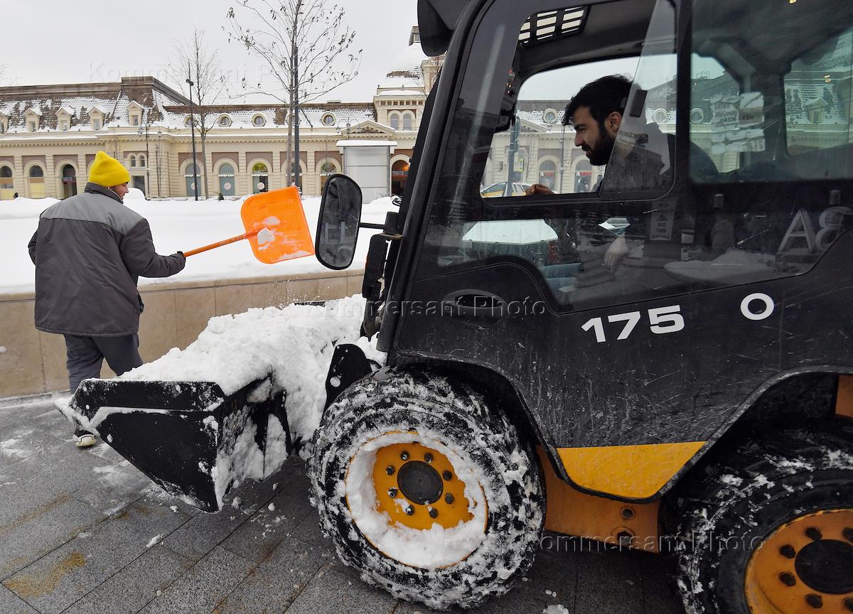 Виды Москвы после снегопада. Жанровая фотография. Уборка снега на площади Павелецкого вокзала.