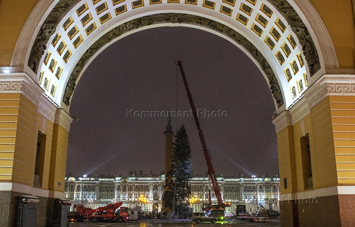 Виды Санкт-Петербурга. Жанровая фотография. Установка новогодней ели на Дворцовой площади.