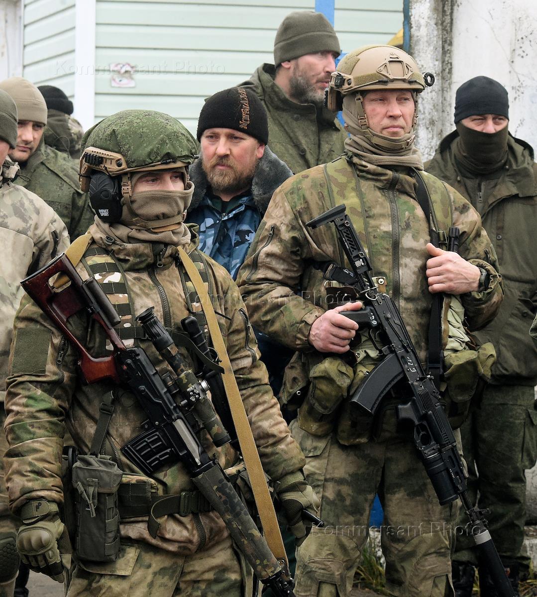 Бойцы Вооруженных сил России во время акции с 160-метровой георгиевской лентой на улице города.…