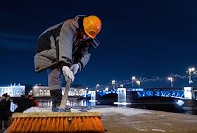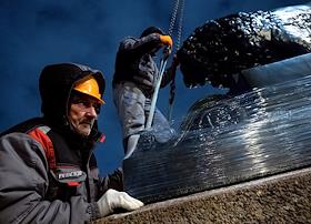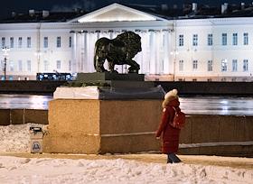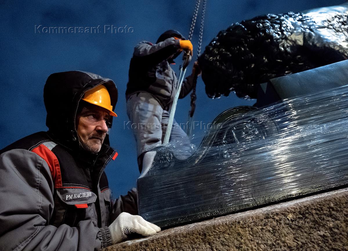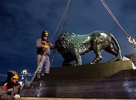 Установка медных львов на Дворцовую пристань Адмиралтейской набережной после реставрации.