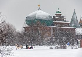 Жанровая фотография. Снегопад в городе. Отдыхающие катаются на санях в парке "Коломенское".