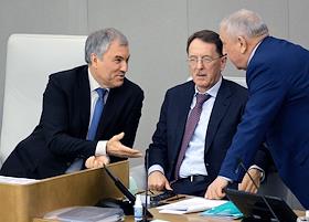 Пленарное заседание Государственной думы (ГД) России. Слева направо: председатель ГД России Вячеслав…
