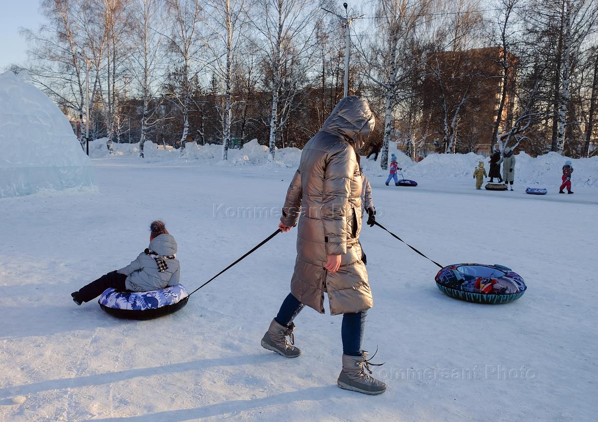 Жанровая фотография. Женщина везет ребенка на надувной "ватрушке" (тюбинге).