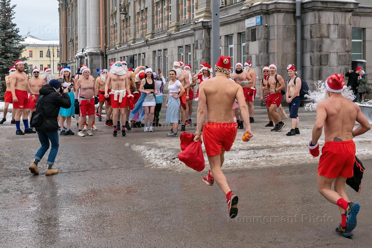 Традиционный забег Дедов Морозов и Снегурочек в Екатеринбурге, организованный Уральской федерацией зимнего плавания.