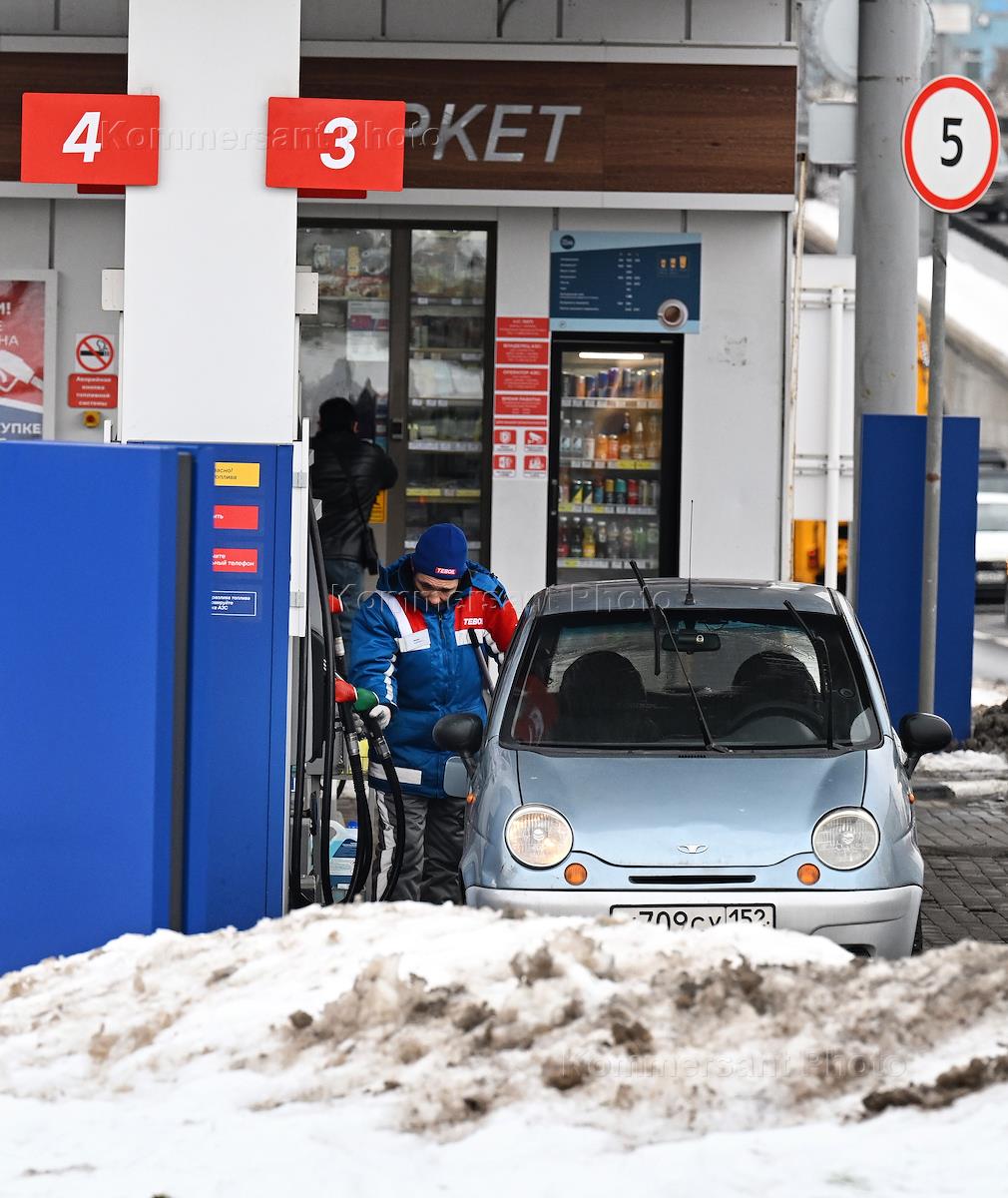 Жанровая фотография. Автозаправочная станция (АЗС) Teboil (бывшая Shell). Заправщик у автомобиля во…