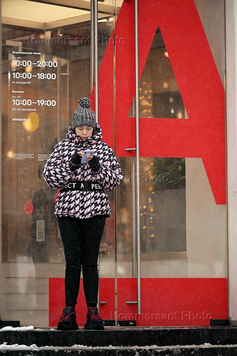 Жанровая фотография. Снег в Москве. Девушка с мобильным телефоном у здания отделения "Альфа- банка".