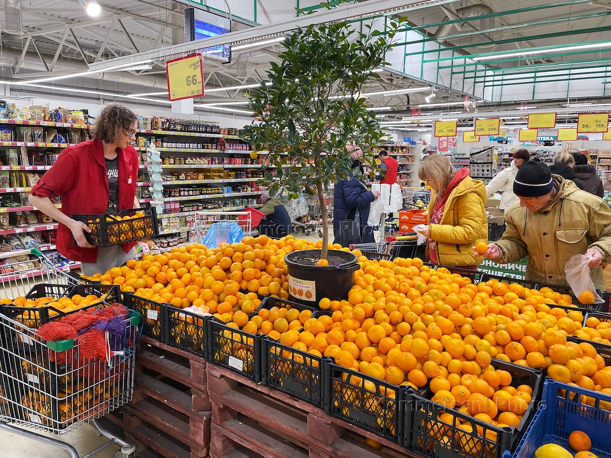 Продуктовые магазины накануне Нового года. Жанровая фотография. Овощной отдел в магазине сети…