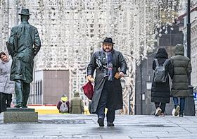 Жанровая фотография. Мужчина несет мягкие игрушки на улице.