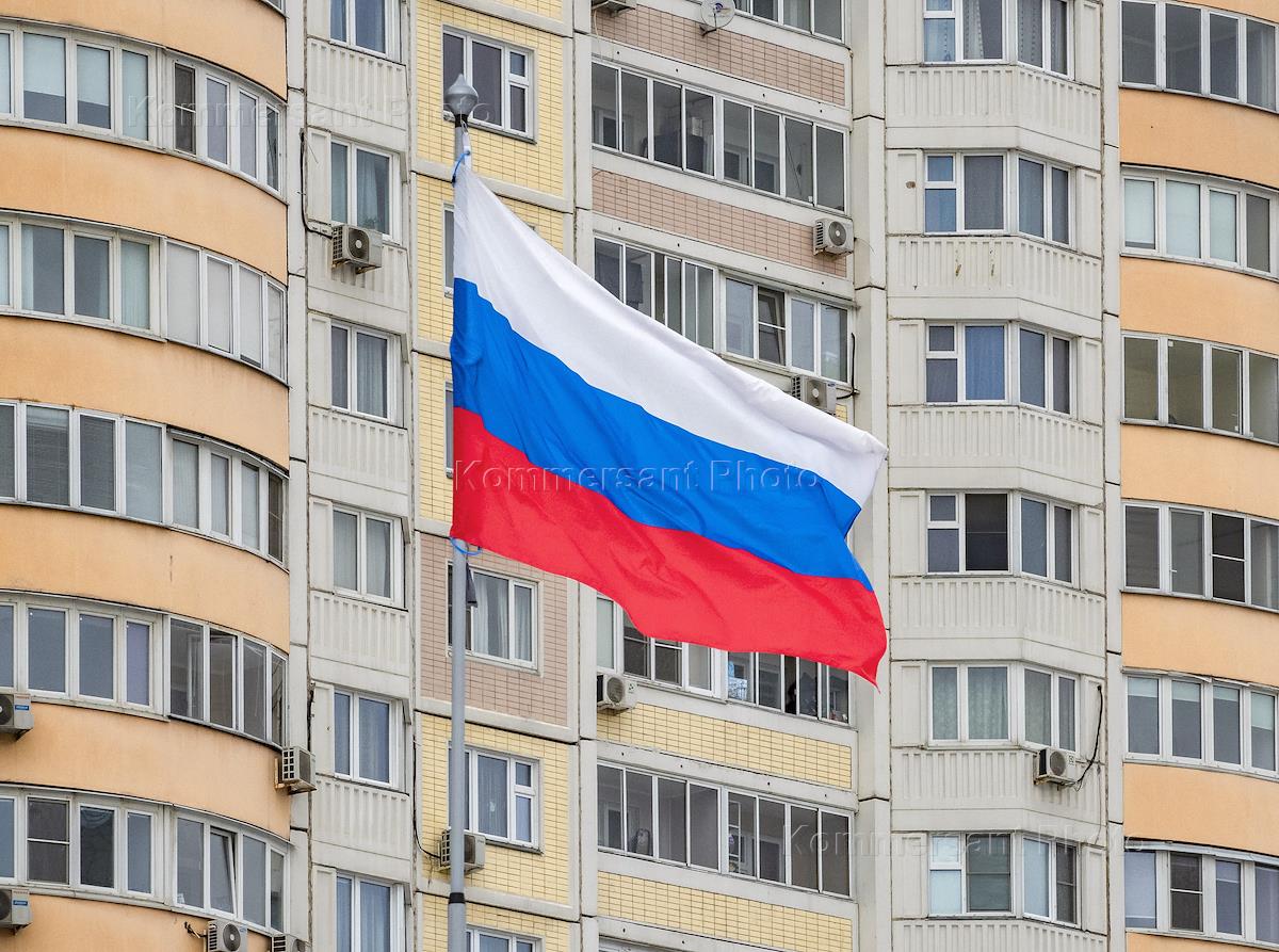 Жанровая фотография. Государственный флаг России на фоне многоэтажного жилого дома.