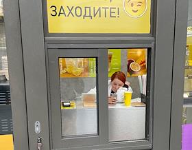 Жанровая фотография. Продавщица со смартфоном в ларьке по продаже кофе.