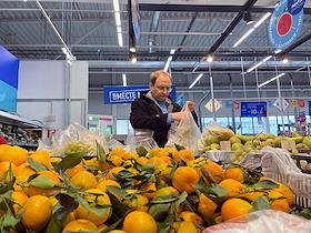 Жанровая фотография. Покупатели у прилавка с фруктами в гипермаркете "Лента".
