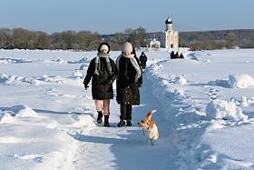 Виды Боголюбово. Храм Покрова на Нерли. Жанровая фотография. Туристы идут по льду реки Нерли.