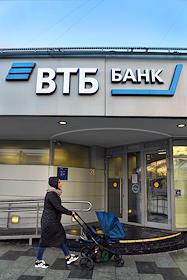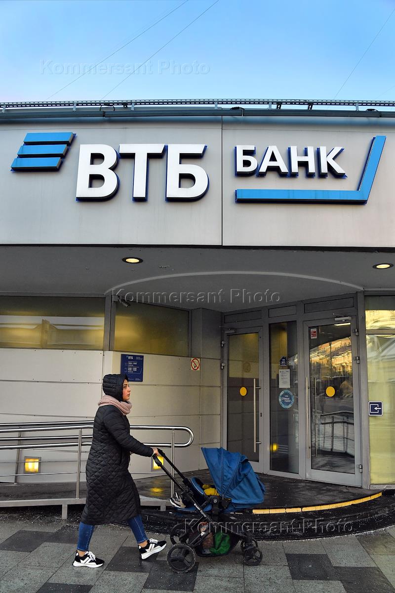 Жанровая фотография. Отделение банка "ВТБ". Женщина с детской коляской едет по улице у отделения.