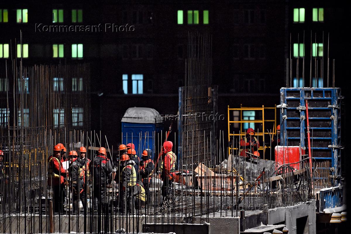 Виды Москвы зимой. Жанровая фотография. Рабочие на строительной площадке жилого дома.