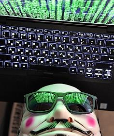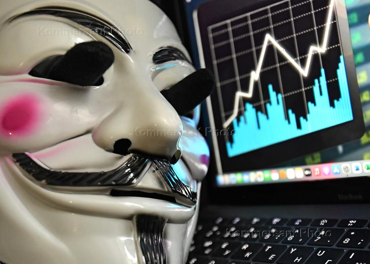 Кибербезопасность. Жанровая фотография. Маска анонима на фоне ноутбука.