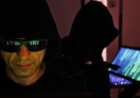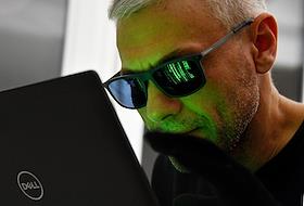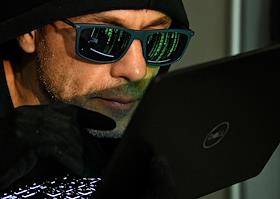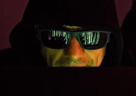 Кибербезопасность. Жанровая фотография. Мужчина в темных очках у компьютера.